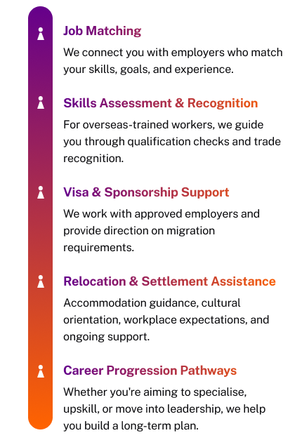 A wide range of occupations are eligible for employer sponsorship or skilled migration programs, making Australia one of the most accessible destinations for qualified workers.