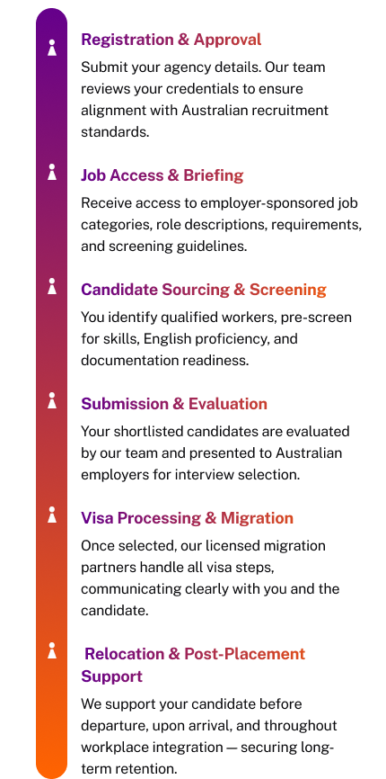 When you join our partner network, you gain access to verified opportunities, migration-backed pathways, transparent processing, and a team committed to long-term worker success.