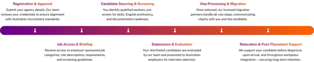 You focus on sourcing qualified candidates; we manage the complex visa and migration requirements through licensed experts.