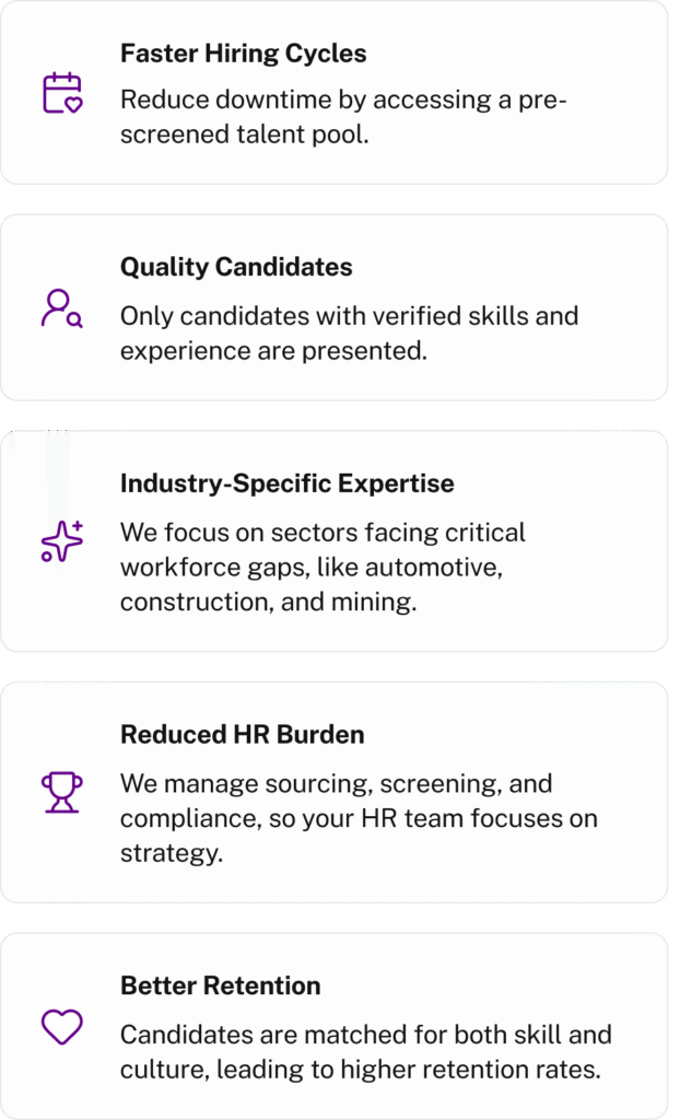 So instead of chasing resumes or navigating complex visa requirements, you can focus on growing your business, while we deliver the people who make it possible.